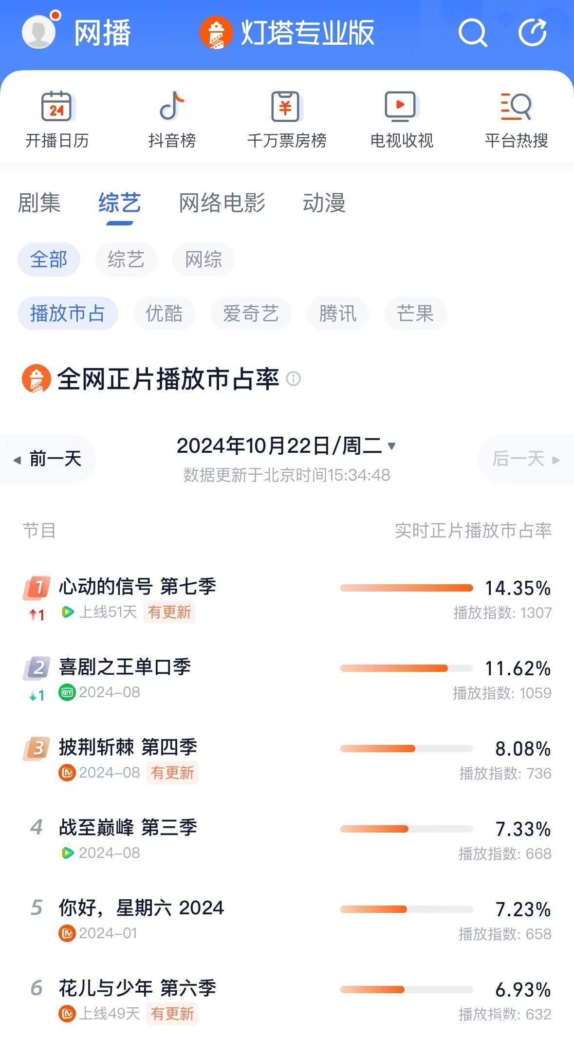 据灯塔专科版数据,《心动的信号7》在开播的前两周都以1000万加的热度拿下抖音综艺榜第别称,尔后一期正片播放率市占率超10%。节目在“黑红”效应中收货声量上的增效。